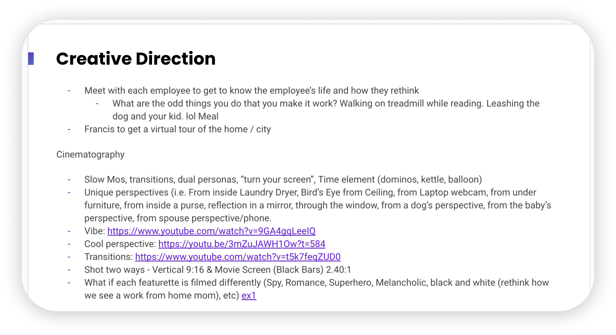 After years of ownership on Video Production projects, I’ve developed a video production process that helps brands execute their videos from start to finish that allows collaboration, strategic alignment, and efficiencies around feedback, all the while making sure the video executed properly within brand guidelines. Here’s an overview and case study of a real campaign I directed: